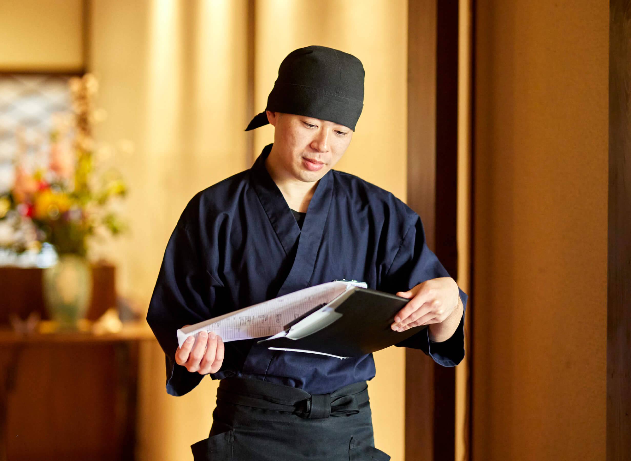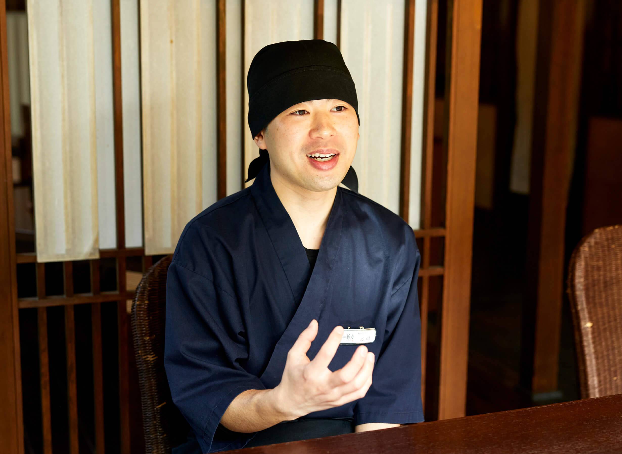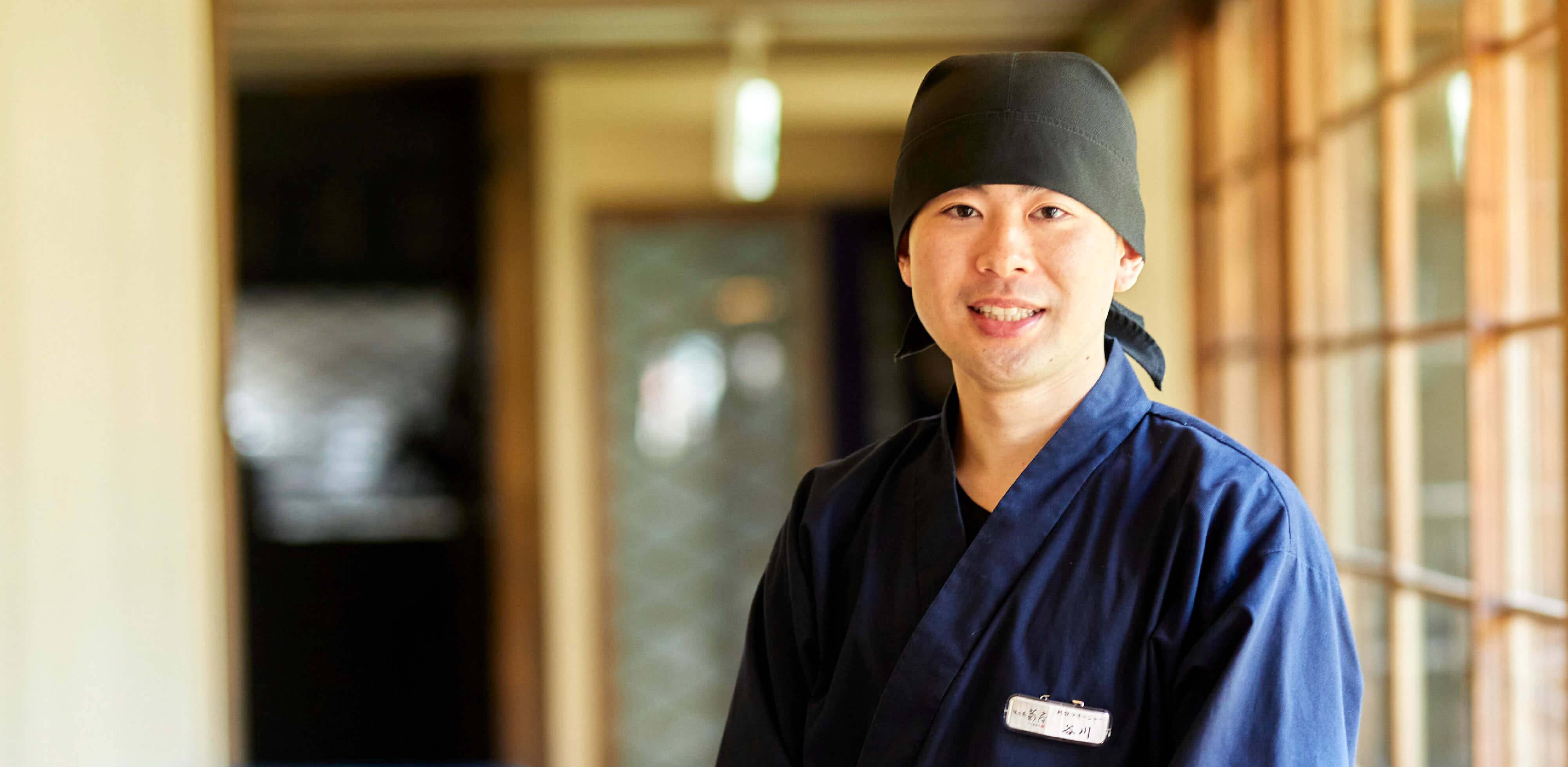 伊豆・修善寺にある温泉旅館「湯回廊 菊屋」の料飲部門の責任者として、レストランのオペレーションマネジメントを任されています。菊屋は創業400年の歴史が息づく老舗宿で、伊豆の旬が詰まった料理も魅力。お客様に修善寺のおいしい郷土料理を味わっていただけるようスタッフの配置や育成を行い、ときには自らサービスすることもあります。